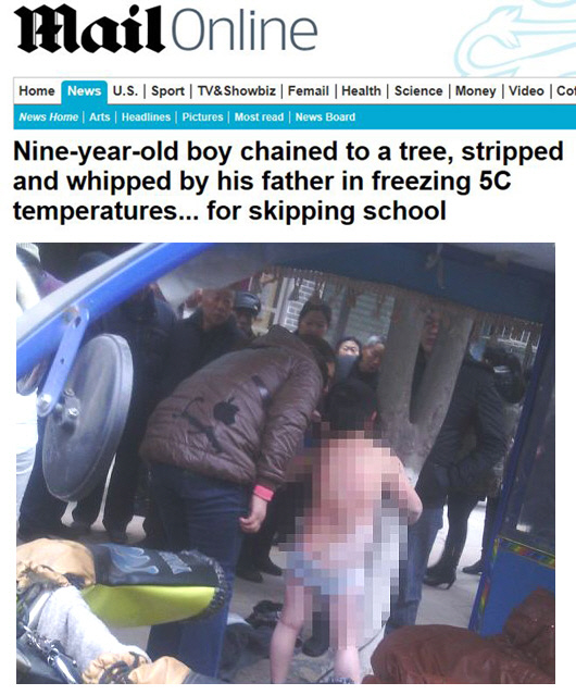 중국 거리에서 알몸인 아들을 폭행하는 모습이 공개돼 네티즌들이 경악하고 있다.