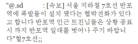 이에 오후 2시경 한 트위터에 "[속보] 서울 지하철 7호선 반포역에 폭발물이 설치 됐다는 협박전화가 있다고 합니다. 반포역 인근 트친님들은 상황 종료 시까지 반포역 일대를 벗어나 주기 바랍니다"라는 글이 게재되는 등 갑작스런 폭발물 설치 소식에 승객들을 불안에 떨게 했다.