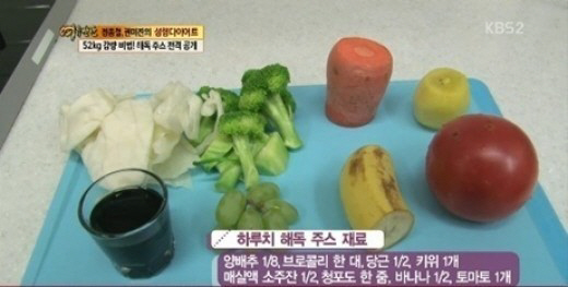 해독주스 재료에는 양배추, 브로콜리 한 대, 당근, 키위, 매실액, 청포도, 토마토, 바나나 등이 필요하다. 이후 재료가 준비가 되면 끓는 물에 넣어 비타민C 파괴를 막고, 매실액은 소주 반 컵 정도를 넣고 토마토, 바나나 등 재료를 모두 넣고 믹서에 갈면 완성된다.