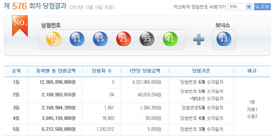 로또576회당첨번호, 10, 11, 15, 25, 35, 41 ‘각 43억씩’