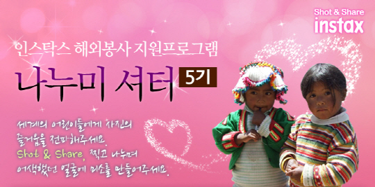 한편, 한국후지필름의 나누미셔터는 해외봉사를 떠나는 대학생들에 인스탁스를 지원하고 봉사 현장에서 만나는 오지 아이들의 모습을 인스탁스로 사진을 찍어 전달하자는 취지에서 진행되는 사진 나눔 활동이다.
