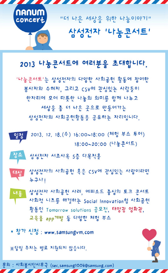 삼성전자가 오는 18일 서울 서초사옥 다목적홀에서 올 한 해 동안 진행한 사회공헌 활동을 돌아보는 '나눔콘서트'를 개최한다.