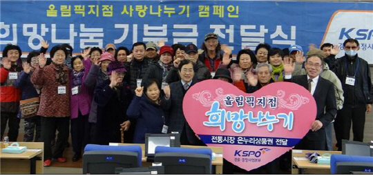 국민체육진흥공단(이사장 정정택) 경륜경정사업본부 올림픽공원 스피존은 연말을 맞아 어려운 이웃들과 사랑을 나누기 위해 지난 11일 신축별관 2층 그린카드 존에서 송파구 저소득가정 40가구에 800만원상당의 온누리상품권을 전달했다.