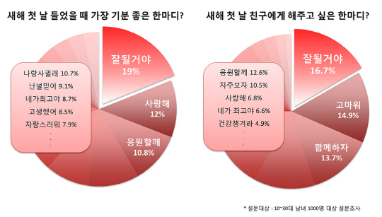 설문조사 결과 젊은이들이 새해를 맞아 가장 듣고 싶은 말은 사랑의 메시지가 아닌 희망의 메시지로 조사됐다. 10~30대 성인 남녀는 새해 첫날 들었을 때 가장 기분 좋은 한 마디로 '사랑해(12.0%)'보다는 '잘 될 거야'(19.0%)를 1위로 꼽았다. 학업·취업·결혼·사회 초년생으로서 받는 스트레스 등 세대별로 자신들이 직면한 문제들이 잘 해결되기를 희망하는 마음이 반영된 것으로 보인다. 특히 '잘 될 거야'를 선택한 비율이 10대(16.7%), 20대(19.9%), 30대(20.5%)로 연령대가 올라갈수록 높아져 현실 속에서 겪는 어려움이 가중될수록 더욱 희망의 메시지를 원하는 것으로 나타났다. 또 새해 첫날 친구에게 꼭 해주고 싶은 한마디도 '잘 될 거야'가 16.7%, 1위로 꼽혔다. 특히 20대는 '잘 될 거야'가 19.4%로 다른 연령대에 비해 가장 높게 나와 취업난을 비롯해 사회 초년생으로서 직면하는 문제들이 잘 해결되기를 바라는 마음이 반영됐다.