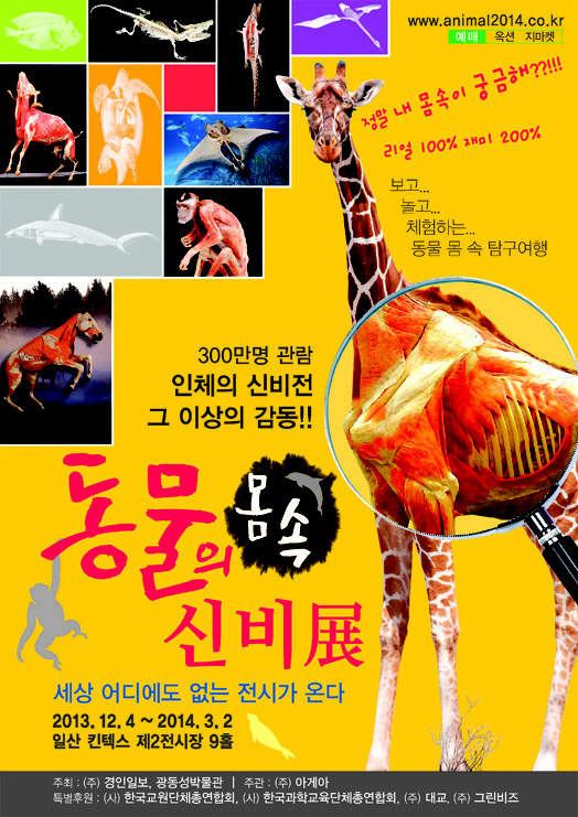 동물의 몸 속을 탐험하는 듯한 체험학습을 유도하는 기획전인 '동물의 신비'전이 내년 3월 2일까지 일산 킨텍스 제2전시장에서 열리고 있다. 주식회사 아게아와 중국광동성박물관이 주최하는 이 전시는 플라스티네이션 기법으로 제작된 전신근육·전신골격·내장·박제 등 100% 리얼한 동물 500여 점이 한 자리에서 선보인다.