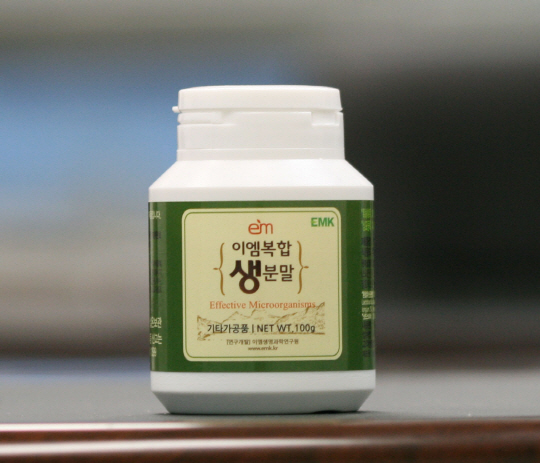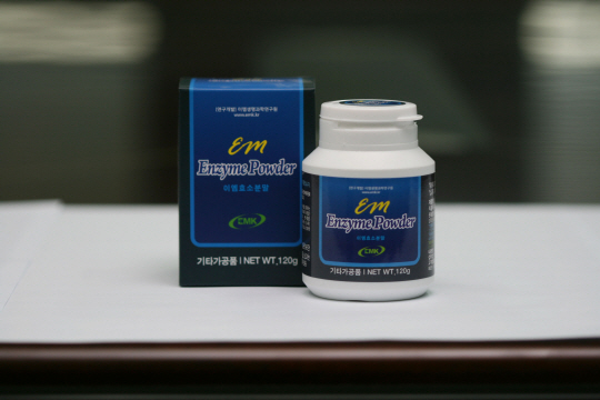 "이엠원액분말과 이엠효소분말이다. 이엠원액분말은 인체에 유익한 미생물을 다량 함유한 제품으로 불균형한 장내 미생물환경을 개선하는데 도움을 주며 미생물 발효과정에서 다량의 영양성분이 생성되는데 도움을 주는 제품이며, 이엠효소분말은 이엠생명과학연구원의 특화된 미생물 균주로 발효과정을 거쳐 생성된 효소제품으로 노화되면서 부족해지는 인체의 효소를 보강해주어 신진대사를 원활히 하는데 도움을 주는 제품이다."