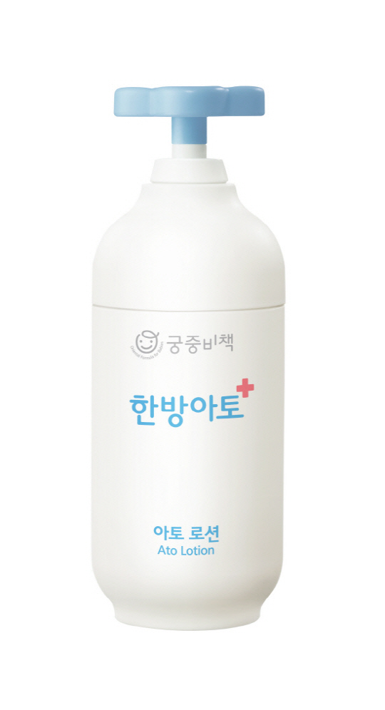 유아전용 한방화장품 궁중비책의 '한방 아토 로션'은 건조하고 민감한 아기 피부를 위한 로션이다. 동의보감 유래 한방 포뮬러 '사물탕'과 '황련해독탕'의 복합 처방으로 피부 순환을 다스리며 건조한 피부의 가려움을 완화해 준다.