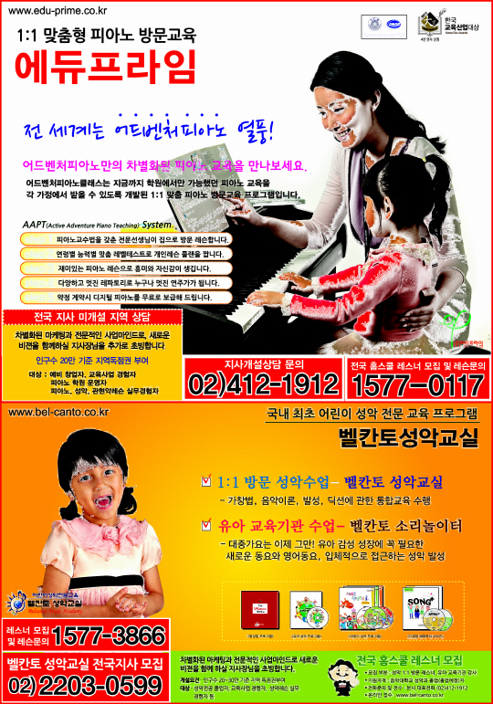 음악교육도 브랜드화 되어가는 시점에서 현재 ㈜ 에듀프라임에서는 가치 있는 교육문화비전을 함께 만들어갈 사업파트너를 모집하고 있다. 벨칸토 성악교실 지사의 경우 20만 인구 기준으로 독점적 지역권을 보장받는 1개 지사 개설을 원칙으로 하고 있다. (02)412-1912