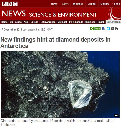 해당보도에 따르면 "영국 남극탐사단의 틸 라일리 박사 등 연구진은 남극 대륙의 프린스 찰스 산맥 북부 메레디스산 등성이 세 곳에서 채취했다"며 "표본을 검사한 결과 다이아몬드를 함유한 킴벌라이트의 단서를 발견했다"고 전했다.