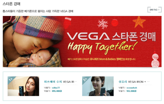 13일부터 19일까지 베가 브랜드 사이트(www.ivega.co.kr)에서 진행된 스타폰 경매 행사 'Happy Together'에는 미쓰에이, 김명민 등 국내 톱스타 30인이 참여해 자신이 사용하던 베가 스마트폰과 애장품을 선보였다.