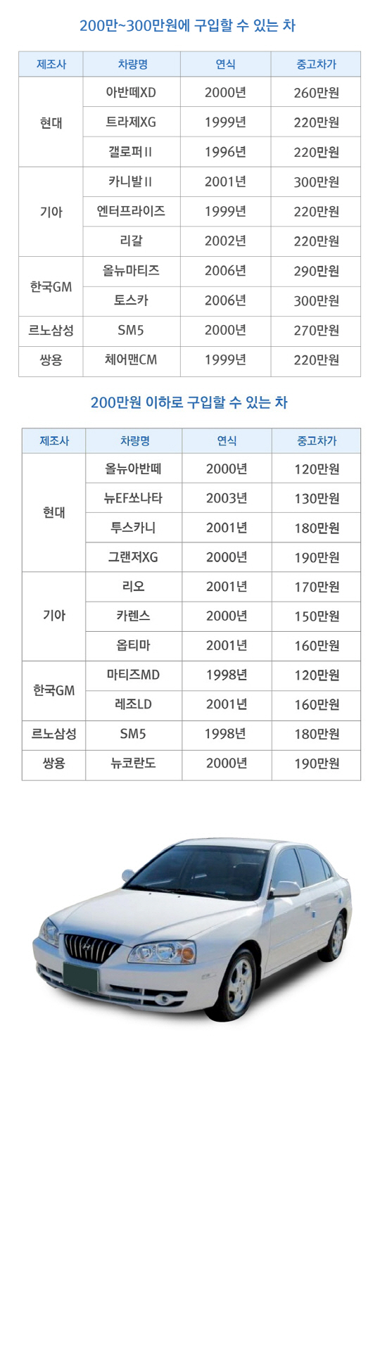 오토인사이드에 따르면 200만원 이하로 구입할 수 있는 차로는 현대 올뉴아반떼, 그랜저XG, 투스카니, 기아 리오, 옵티마, 한국GM 마티즈MD, 르노삼성 SM5, 쌍용 뉴코란도 등이 있다. 2000년식 올뉴아반떼를 120만원에, 2001년식 투스카니를 180만원에, 2000년식 그랜저XG를 190만원에 각각 구입할 수 있다.