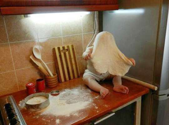 공개된 사진 속에는 한 아이가 요리대 위에 올라가 밀가루 반죽을 뒤집어 쓴 모습이 담겨있다.
