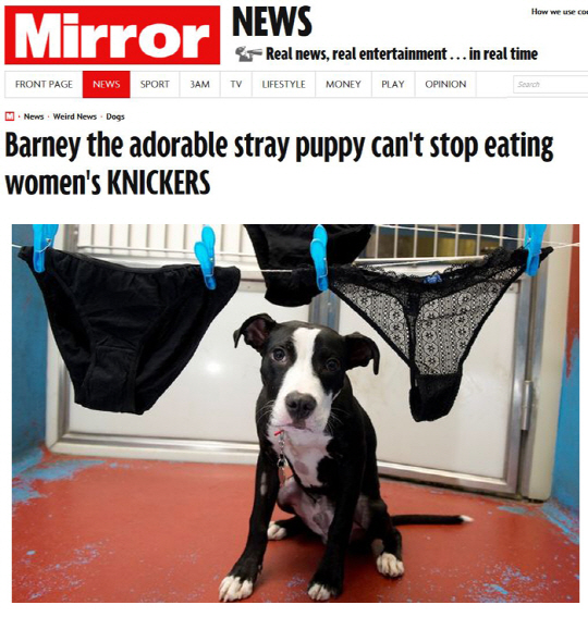 이번주초 보호소 직원이 바니를 공원에 데려가 산책시키던 중 용변에서 이상한 것을 발견했다. 알고보니 여성용 속바지였던 것. 그 직원은 속옷이 소화되지 않은 채 모양 그대로 배변됐다고 전했다.