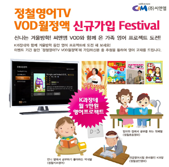 수도권 최대케이블TV방송사 ㈜씨앤앰(cable & more, 대표 장영보)이 겨울방학 시즌을 맞아 어린이부터 성인까지 모두 영어를 학습할 수 있는 VOD 월정액을 선보인다.