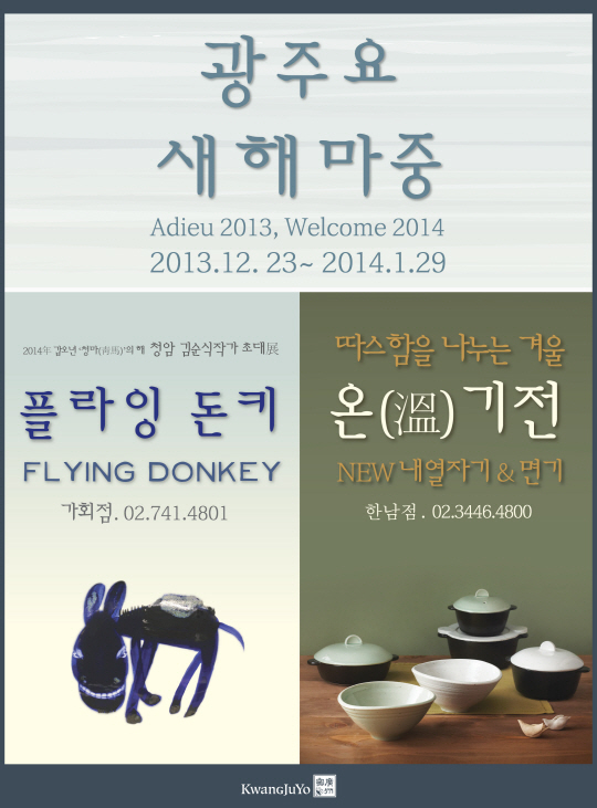 광주요는 23일부터 2014년 1월 29일까지 서울 2곳의 광주요 직영점(가회, 한남)에서 '새해마중(Adieu 2013, Welcome 2014)' 신년 특별기획전을 실시한다. 신년 특별기획전은 광주요가 연간으로 진행하는 전통도자기 문화 확산을 위한 문화축제의 일환으로 2013년 한 해 동안 감사의 마음과 2014년 희망찬 새해를 기원하는 뜻에서 기획됐다.