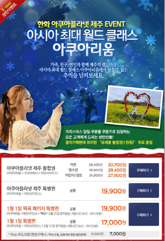 아시아 최대 월드 클래스 아쿠아리움과 함께하는 크리스마스 유채꽃 특별 이벤트는 쿠폰통 홈페이지 (http://www.coupontong.co.kr)에서 확인 가능하며 고객만족센터(1661-1063)를 통하여 안내 받을 수 있다.