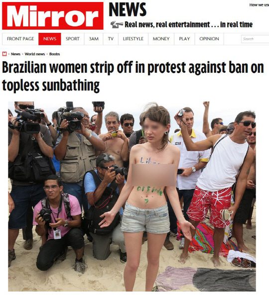 브라질 해변에서 여성들이 상의를 벗은 채 시위를 벌여 눈길을 끌었다.