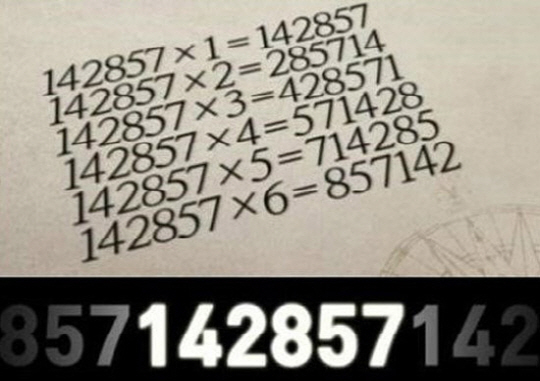 142857에 숫자 1에서 6까지 곱하면 '142857×1=14285', '142857×2=285714', '142857×3=428571', '142857×4=571428', '142857×5=714285', '142857×6=857142'로 모든 결과가 142857과 배열만 다른 숫자가 된다.