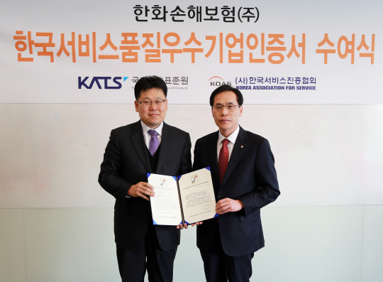 한화손해보험(대표 박윤식)은 24일 서울 영등포구 여의도 본사에서 산업통상자원부 국가기술표준원으로부터 서비스품질 우수기업(보험서비스업)으로 선정되어 인증수여식을 거행하였다.