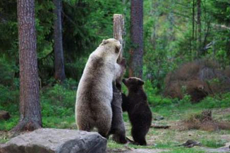사진 속 어미곰은 새끼곰 두 마리에게 3m 높이의 나무를 오르는 방법을 알려주는 모습이 담겨 있으며, 특히 곰들은 마치 봉춤을 추는 듯 한 착각을 주기도 해 눈길을 끈다.