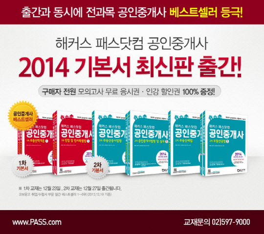 해커스 패스닷컴 공인중개사는 2014년 해커스 패스닷컴 공인중개사 기본서 시리즈 출간을 기념해 교재 구매자 전원에게 동영상 강의 30% 할인쿠폰과 총 3회 온라인 전국모의고사 무료 응시권을 증정한다. 2014년 해커스 패스닷컴 공인중개사 기본서 시리즈는 해커스 공인중개사의 전과목 스타강사진이 직접 집필함은 물론 교재 전과목의 저자들이 직접 강의하는 현장강의를 제공해 학습자의 이해도를 높였다.