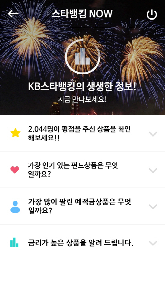 화면 구성도 기존 은행업무 중심의 획일화된 아이콘 나열 방식에서 벗어나 자연 이미지를 배경으로 고객이 필요한 아이콘을 심플하게 배치했고, 전체메뉴, 홈화면, MY KB, 금융센터로 물 흐르듯 쉽게 연결되는 구조로 개편했다.