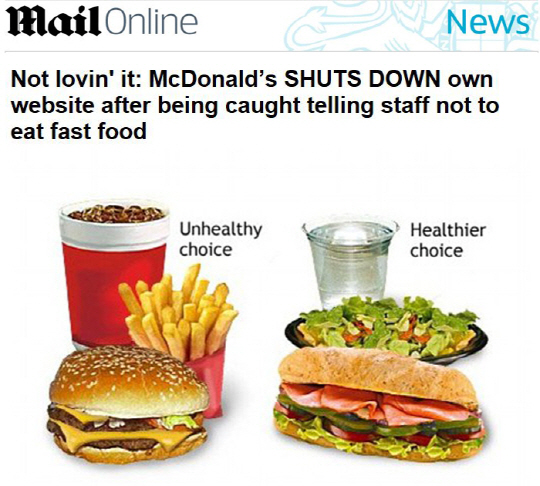 글로벌 패스트푸드 업체 맥도날드가 직원 전용사이트에 패스트푸드의 유해성 글이 올라와 화제다.