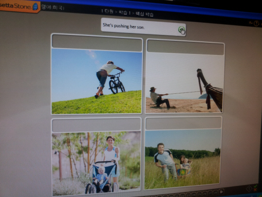 로제타스톤은 단계별로 형식이 조금씩 바뀌어서 진행된다. 이중 5단계에선 문장을 볼 수는 없고,듣고서 그 상황에 맞는 그림을 선택하는 형식이다. 단계별로도 조금씩 차이를 두어서 지루하지 않게 게임을 하듯, 학습할 수 있도록 했다.
