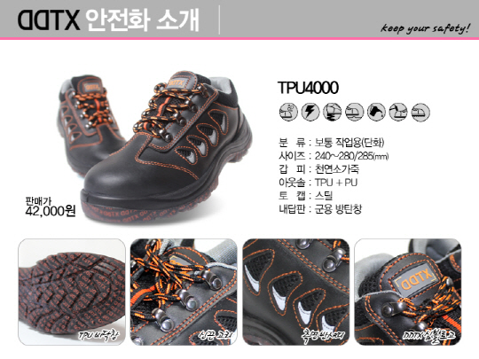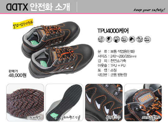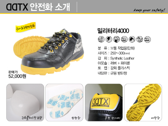 발 형태에 맞게 슬림한 디자인들의 DDTX 제품들 중 '밀리터리 4000'은 현재 국내 출시된 안전화 중 가장 가벼운 안전화이면서도 경작업용이 아닌 보통작업용으로 KCS(한국안전인증)까지 받아 기능면에서도 훌륭하다는 것을 입증한 제품이며 좀처럼 보기 드문 300mm 사이즈까지 갖추어 모든 고객들의 만족도를 높이고 있다.