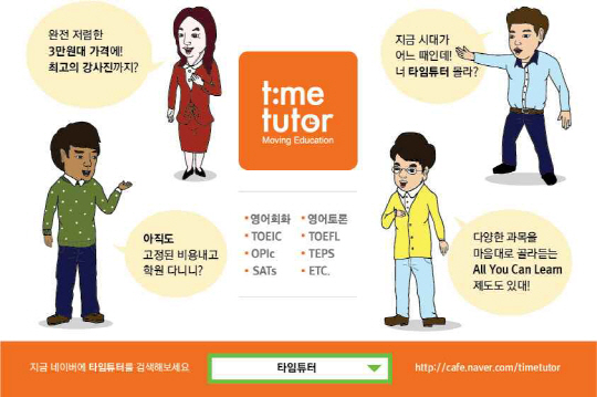 '타임튜터'는 기존의 어학원보다 파격적으로 저렴한 가격으로 우수한 강사들에게 퀄리티 높은 수업을 들을 수 있다. 지정된 학원에서 수업이 진행되는 것이 아니라 종로, 강남, 일산 등 각 지역의 스터디룸에서 최대 6명의 소수정예의 수강생으로 수업이 진행되기 때문에 수업의 몰입도가 높고 강사와 친숙하게 공부할 수 있다는 장점을 갖고 있다.