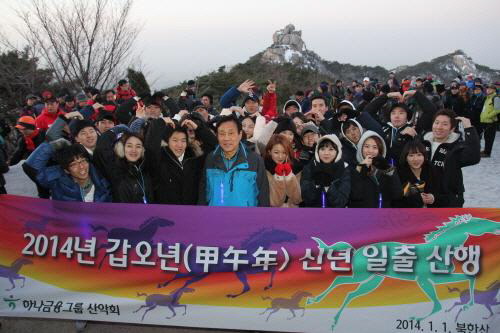 하나금융그룹(회장 김정태)은 김정태 회장과 하나은행 산악회 회원을 비롯한 지주사, 하나은행 임직원 및 하나금융그룹 SMART 홍보대사 등 총 400여명이 북한산에서 2014년 갑오년 새해 첫 일출을 맞이하며 건강한 소통과 건강한 출발을 다짐하는 산행을 실시했다고 밝혔다.
