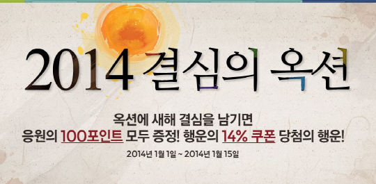 행사 페이지에 '2014년 나의 다짐' 내용을 남기면 참여자 전원에게 100포인트를 제공하고 2014명을 추첨해 14% 할인쿠폰(최대 5000원 할인)을 증정한다.