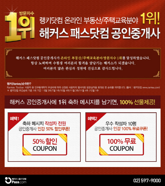 해커스 패스닷컴 공인중개사 학원은 최근 온라인 랭킹 정보 사이트 랭키닷컴이 선정한 온라인 부동산-주택교육분야 1위를 기념해 이벤트도 진행한다. 이벤트 페이지에 1위 축하 메시지를 남기면 작성자 전원에게 공인중개사 동영상강의 50% 할인쿠폰을 증정한다. 또 우수 작성자 10명에게는 동영상강의 100% 무료쿠폰을 제공한다.