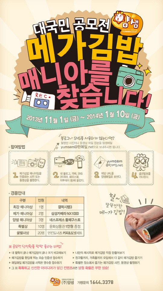 메가김밥은 기존 김밥의 두 배가 되는 팔뚝만한 사이즈로 압도적인 비주얼부터 남다르다. 속이 꽉 찬 메가김밥은 참치김밥과 불고기김밥을 반반 즐길 수 있고 출시되자마자 연일 이슈가 되며 현재까지 전국적으로 12만2129줄의 판매기록을 세우기도 했다. 개인 블로그에는 자발적인 고객후기가 100여개에 달했다. 얌샘에 따르면 이벤트는 고객사랑에 보답하기 위해 기획됐다. 기간은 1월 10일(금)까지다. 최강매니아로 뽑힌 1명에게는 갤럭시탭3를, 메가매니아로 뽑힌 2명에게는 삼성카메라 NX1000을 제공할 예정이다. 그 외에도 네스프레소 돌체구스토, 문화상품권, 기프티콘 등 푸짐한 경품이 제공된더. 2013년 다양한 이벤트를 기획하며 고객들의 열띤 참여를 이끌었던 얌샘은 2014년에도 새로운 이벤트로 고객과 함께하는 얌샘 브랜드를 만들 예정이라고 밝혔다.