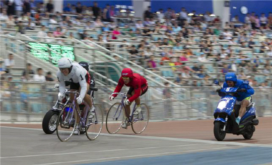 ◇지난해 7월 14일 광명스피돔에서는 자전거와 오토바이의 이색 대결이 펼쳐졌다. 이날 열린 경기는 경륜팬들의 뜨거운 관심과 갈채를 받았다.