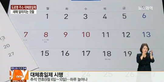 2014년 대체휴일제가 추석연휴부터 첫 적용된다. 대체 휴일제는 법정 공휴일이 일요일과 겹칠 때 평일 하루를 더 쉬는 제도로 올해 공휴일은 12년 만에 최대인 67일이다.