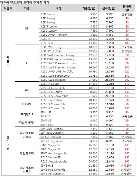 재규어 랜드로버 코리아는 한·미 자유무역협정(FTA) 개별소비세 인하분을 반영한 2014년 전차종의 새로운 가격을 발표했다.