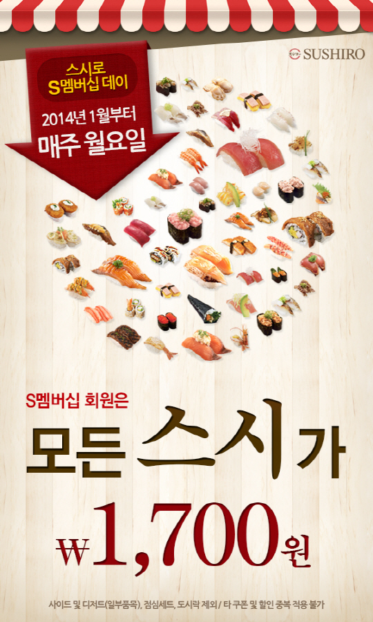 세계 최대의 회전초밥 레스토랑 스시로한국(대표 최세철)은 오는 1월6일부터 S멤버십 고객에 한해 모든 스시를 1,700원 균일가에 판매하는 프로모션을 실시한다.