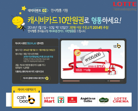 이달 1일부터 10일(금)까지 롯데홈쇼핑에서 3만원 이상 구매하는 고객 중 총 2014명을 추첨해 캐시비카드 10만원권을 증정한다.