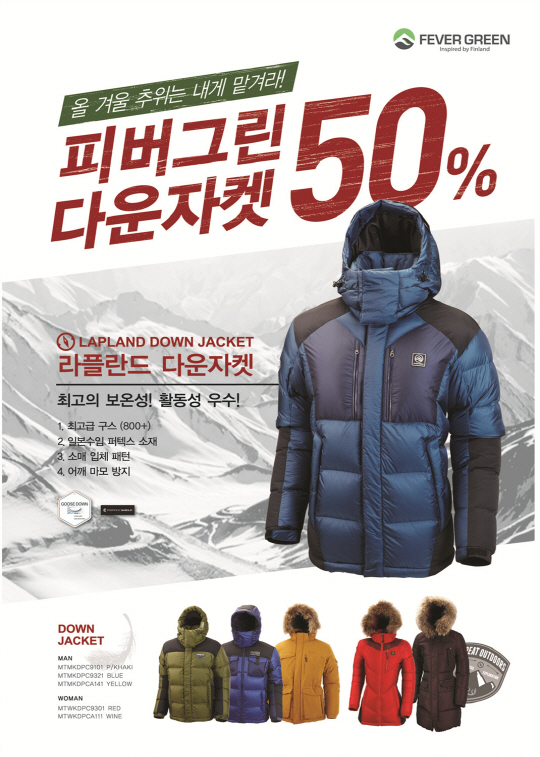 피버그린의 올겨울 인기 제품으로 핀란드 최북단 지역명을 그대로 따 온 전문가형 구스다운 재킷 '라플란드(LAPLANND)'를 꼽을 수 있다. 필파워 800 이상의 거위털 충전재를 사용해 한겨울 아웃도어 활동 시 따뜻하게 체온을 유지시켜준다. 입체 소매 패턴으로 활동성이 뛰어나고, 배낭으로 인한 마모 현상을 최소화 시켜주는 어깨 프로텍트 필름으로 우수한 내구성을 자랑한다. 또한 고밀도 투습 소재인 '퍼텍스(PERTEX)' 원단을 사용해 방수 기능이 탁월해 눈이나 비 등 궂은 날씨에도 적합하다. 정상가격은 78만원이나 시즌오프 행사를 통해 50% 할인이 적용되고, 19일까지 구매 고객에 한해 겨울 아웃도어 모자를 증정한다.
