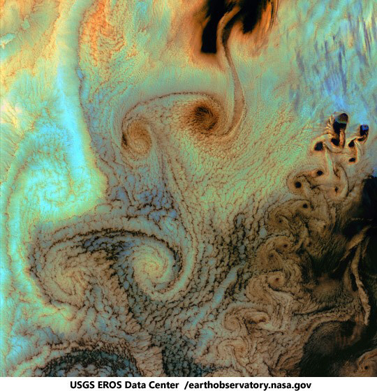 특히 빠른 속도로 진행하던 바람이 섬 등 물체에 부딪히면 위로 솟아오르거나 주변으로 우회하게 되는데, 이 때 이런 구름 소용돌이가 모습을 드러내게 되는 것이다.