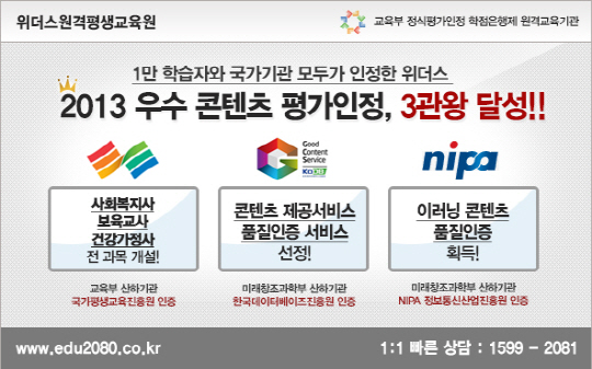 위더스원격평생교육원(www.edu2080.co.kr)이 사회복지사, 보육교사, 건강가정사 등 평생교육진흥원으로부터 2013년 총 28과목을 평가인정 받았다.