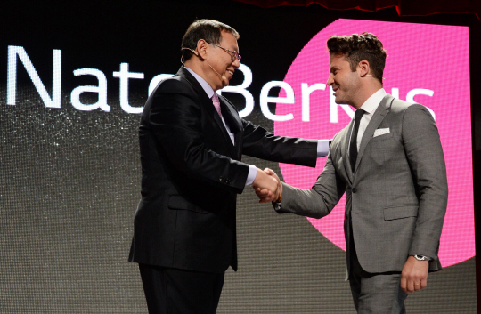 | ◇6일(현지시각) 라스베이거스 만달레이베이 호텔에서 프레스 컨퍼런스에서 LG전자 HA사업본부장 조성진 사장(왼쪽)이 프리미엄 주방가전 패키지인 'LG 스튜디오'와 유명 인테리어 디자이너인 '네이트 버커스'와의 협업을 공식 발표하고 '네이트 버커스'와 악수를 나누고 있다. |