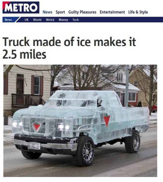 3일 영국 매체 메트로는 "캐나다의 한 얼음조각 업체가 약 5톤 분량의 얼음으로 2005년식 GMC트럭 실버라도를 제작하고 운행하는데 성공했다"고 보도했다.
