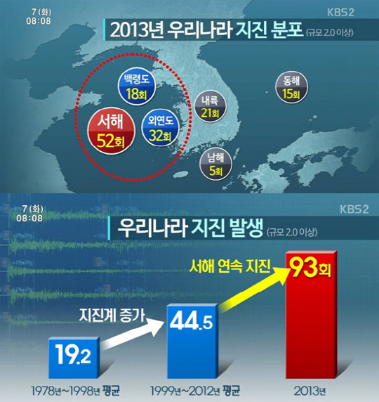 7일 KBS 뉴스에 따르면 지난해 한반도에는 지진 관측 이래 가장 많은 93차례의 지진을 기록했다. 특히 지난해 6월부터 11월까지 잇따른 외연도 지진은 모두 32차례, 외연도 뿐 아니라 백령도 해역 18차례 등 서해 지진이 52차례로 다른 지역보다 훨씬 많았다.