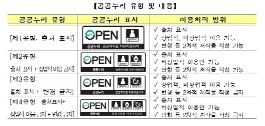'공공누리'는 국가, 지방자치단체 및 공공기관이 민간의 자유로운 공공저작물 이용을 위하여 공공저작물을 개방하고자 할 경우, 명확하고 통일성 있는 표시와 조건을 통해 이용자의 혼란을 방지하고 공공저작물의 활용을 촉진하기 위한 제도로서, 공공누리의 표시가 부착된 공공저작물은 이용자가 별도의 계약이나 저작권자의 의사 확인 절차 없이 일정한 이용 조건하에서 공공저작물을 무료로 자유롭게 사용할 수 있도록 하는 제도이다. 표준화된 이용허락은 출처 표시가 기본 조건이며, 예외적으로, 공공기관이 필요에 따라 상업적 이용금지 또는 변경금지의 조건을 선택적으로 부과할 수 있다. 즉 이용허락 조건의 자유도 수준에 따라 4가지 유형의 이용허락이 가능하다.