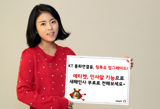 KT는 휴대폰 통화연결음 서비스 '링투유'를 업그레이드 해 발신자에게 무료로 멘트를 전할 수 있는 에티켓과 인사말 기능을 새롭게 제공한다고 8일 밝혔다.
