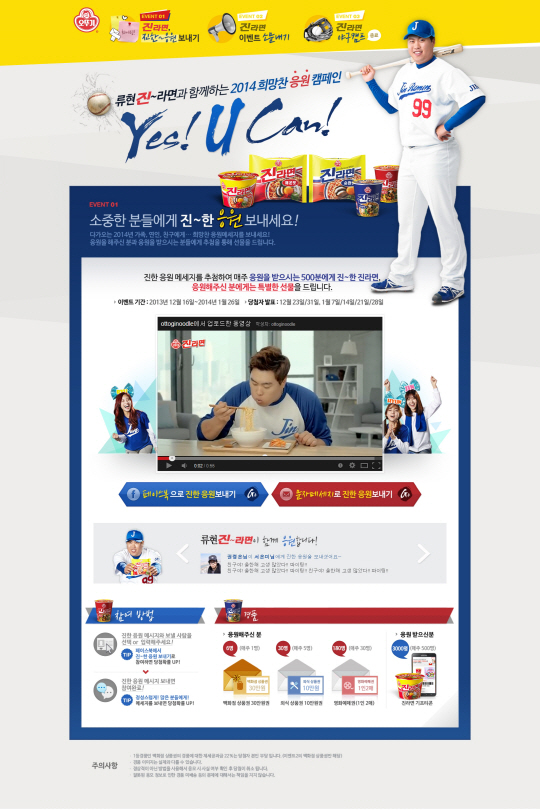 오뚜기가 2014년 청마의 해를 맞아 가족, 연인, 친구에게 응원의 메시지를 전달하는 '류현진~라면과 함께하는 2014 희망찬 응원캠페인'을 마련했다.