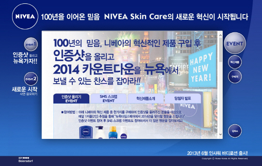 글로벌 스킨케어 브랜드 니베아는 지난 연말 고객 이벤트를 했다. 뉴욕 타임스퀘어의 연말 이벤트인 '2014 카운트다운'에 6쌍을 초대하기로 했다.