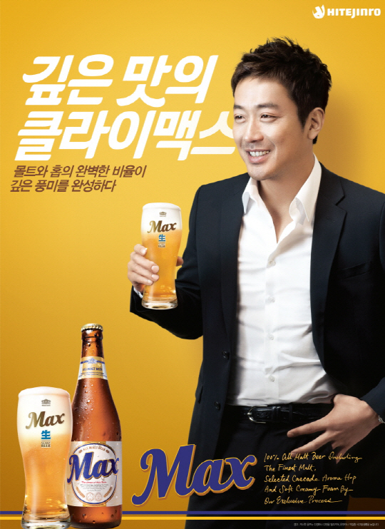 하이트진로(www.hitejinro.com) 100% 보리 맥주 브랜드 '맥스(Max)'는 지난해에 이어 2014년에도 배우 하정우를 전속모델로 선정했다고 9일 밝혔다.